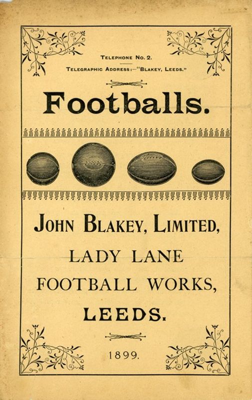 The flyer was produced in 1899 by John Blakey Ltd to advertise the different kinds of footballs they made, and the prices they sold for on the wholesale market. They described their factory as a Football Works, with an address on Lady Lane in Leeds. Made of leather or cowhide, the balls were made for both rugby and football and came in children’s sizes, as well as for adults. There is a similar leaflet in the collection of the National Football Museum that dates slightly earlier to 1895. From the tone of both leaflets, it is clear football production was a new venture for John Blakey and the firm was working hard to drum up business—they could “turn out quantities at very short notice.” The 1899 copy tells that they had “trebled their output” from the 1898 season!