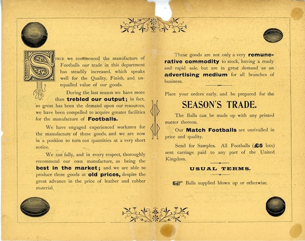 Significantly, standardisation of the size of footballs was only set out in 1872 by the Football Association (FA). They stated that balls “must be spherical with a circumference of 27–28 inches.” These dimensions are still used today! Looking at the tone of the leaflet, the design emphasises continuity, and it’s interesting to wonder if this factory was the first in Leeds to produce balls to these new official standards.