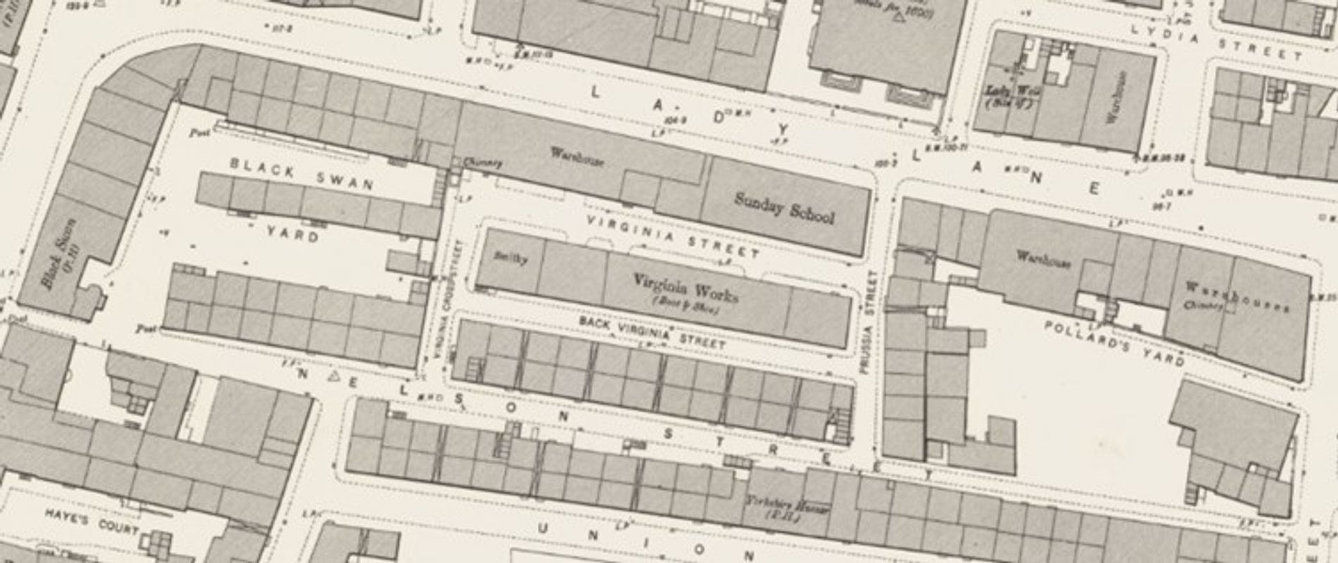 Newspaper articles and historic maps help us to discover how Blakey expanded the capacity of his factories. Using the 1890 ordnance survey map we can understand more clearly where the factory was. In the centre of the map is a building called Virginia Works—this was owned by E. Blakey, who bought it from a cabinet maker called E. W. Batley in a sale on 6 December 1867. From cabinet making, Blakey adapted the building to a leatherworks, producing the boots and shoes that are described on the map. Much of the skills needed to make a boot are like those that are needed to make balls, and the manufacture of footballs was an extension of the products they already made. The warehouse in the map was also owned by Blakey, and it is this building that took the name of the street it was on—Lady Lane.