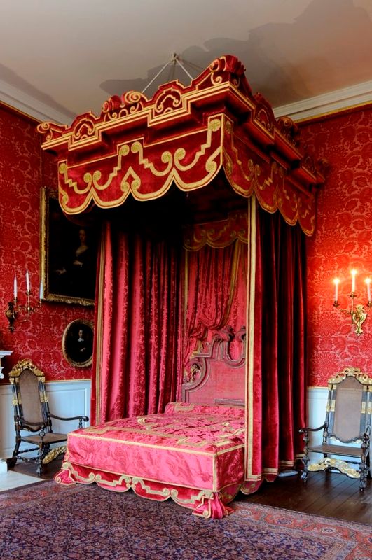 The white window curtains mentioned in the receipt at first seem a little incongruous or plain alongside the rich damasks and tapestries. While it was the practice in the late 17th and early 18th century for curtains to match the rest of the upholstery in the room, contrasting white curtains were also used. Certainly, the simplicity of the curtains would have meant that the eye was drawn to the main event – the bed.