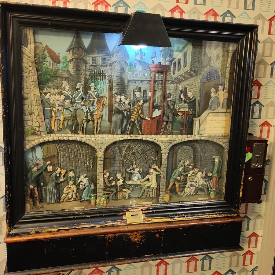 By 1884 John had a small exhibition (possibly already in Blackpool). His machines had melodramatic subjects, such as the Dying Child, Drunkard’s Delirium, Haunted Miser and of course the French Execution (now owned by Leeds Museums), pictured above.