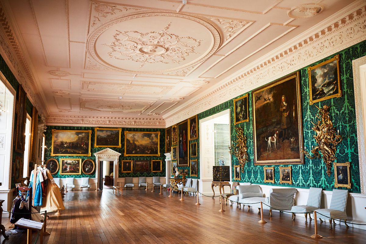 The design theme of the Picture Gallery – besides demonstrating the Ingram family’s loyalty to the Royal family – evokes other environments within the room, to bring ‘the outside in’. The rich green of the flocked wallpaper, complete with stylised leafy patterns, provides a backdrop for paintings and furniture that suggest the outside world. Many of the paintings feature landscapes and seascapes, including the backdrop to the large portrait of the 7th Viscount’s father, the 3rd Viscount Irwin, Arthur Ingram, who is shown hunting. The two chimney pieces feature figures representing the four seasons.