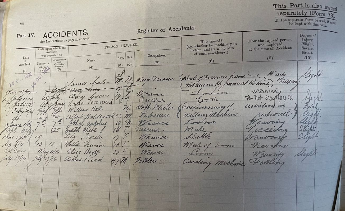 Below is an image of the incident book from 1902. Incidents like these would be recorded in more detail in modern factories. As we can see from the image below, most of the workers who were injured were weavers; a couple were injured while operating the loom, and others were injured while operating the loom.