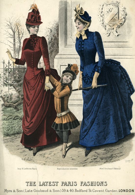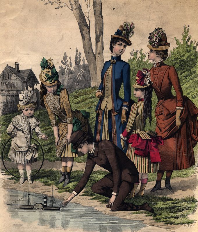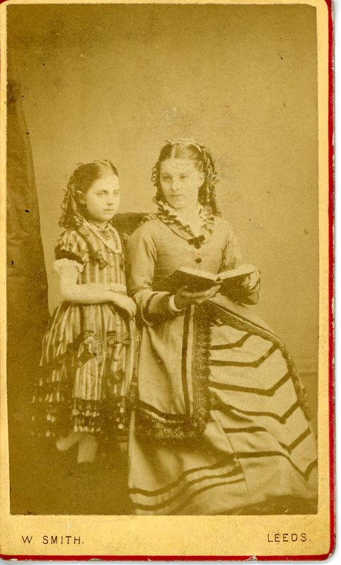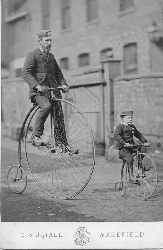 Other outfits include a father and son in Wakefield wearing suits and riding matching penny farthing bikes, a fashion print from a Victorian women’s fashion magazine from around 1885 and a carefully posed picture of a mother and daughter from the 1860s, both wearing formal dress.